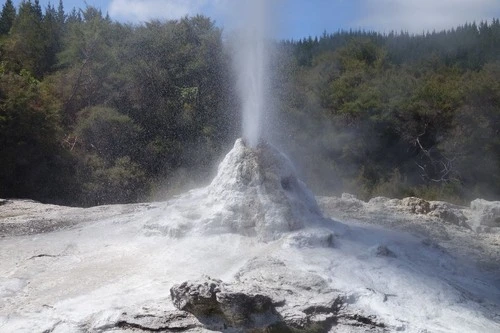 El Lady Knox Geyser està situat al Waiotapu Thermal Wonderland a Nova Zelanda i és el guèiser més gran de l'hemisferi sud. És un espectacle espectacular, ja que cada dia a les 10.15 h (si el temps ho permet!) entra en erupció fins a una alçada de fins a vint metres. L'erupció dura uns 15 minuts, seguits per vapor esvalotat. És un fenomen natural increïble que no et pots perdre! El Waiotapu Thermal Wonderland també acull nombroses altres atraccions com basses de fang torrant, fonts termals, basses de sulfur i llacs blaus vius. Els colors brillants de les terrasses fumoses són causats per algues i bacteris que prosperen a les fonts termals riques en minerals. No hi ha millor manera d'experimentar realment la bellesa de la regió que presenciar el Lady Knox Geyser per tu mateix.