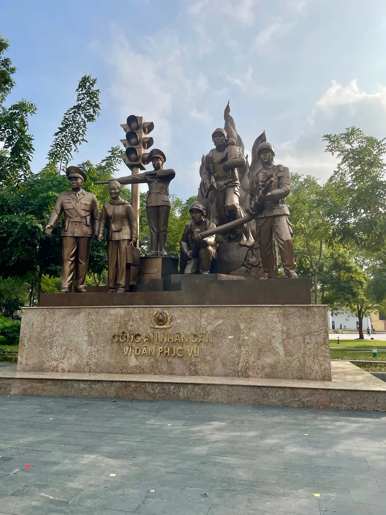 L'estàtua de l'Oficial de Policia i Bombers, situada a Hai Bà Trưng, Vietnam, és un monument dedicat a dos valents homes vietnamites que van perdre la vida intentant salvar-ne d'altres. Va ser erigida el 2003 i mostra els dos homes en els seus uniformes, mirant cap al futur. L'estàtua està envoltada d'entorns culturals com pagodes, i simbolitza el sacrifici heroic i la dedicació al servei públic. Sens dubte, val la pena visitar-la tant per turistes com per fotògrafs per retre homenatge a aquests dos valents oficials. Capturar perfectament la bellesa de l'escultura combinada amb l'entorn ofereix fotos úniques i boniques.