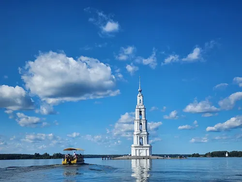 Kalyazinskaya Kolokol'nya, známá také jako Kalyazinská zvonice, se impozantně vyjímá z vod řeky Volhy, označuje místo ponořené části historického města. Postavena na počátku 19. století jako součást velkolepého komplexu Makaryěvského kláštera, kdysi hrdě stála na pevnině, ale po výstavbě Ugličského přehrady ve 40. letech 20. století byla okolní oblast zaplavena, takže tato šestipatrová zvonice je částečně ponořená. S výškou přibližně 74,5 metru vytváří děsivou, ale přitažlivou scénu, zejména při pohledu z člunu nebo z nedaleké promenády. Okolní plošiny jsou ideální pro krásné fotografie a místní prohlídky často zahrnují výlet lodí blíže ke zvonici pro nezapomenutelný osobní zážitek.