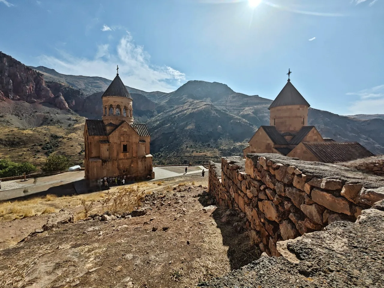V malebné soutěsce u řeky Amaghu se nachází Noravank, arménský klášter z 13. století, proslulý ohnivě rudými útesy, které vytvářejí dramatické pozadí pro fotografii, zejména při západu slunce. Klášterní komplex je znám složitými chachkary (křížovými kameny) a kostelem Surb Astvatsatsin (Svatá Matka Boží) s jedinečnými architektonickými prvky, jako je dvoupatrový půdorys s úzkými venkovními schodišti, jež jako by visely u stěn. Fotografové ocení světlo pronikající zdobenými okny a malebné rámy starověkých kamenných reliéfů, včetně vyobrazení světic a zvířat. Kontrast ostrých rudých útesů a bujné zeleně dodává scéně surrealistickou krásu, ideální pro dechberoucí záběry. Nejlepší doba k návštěvě je jaro a podzim, abyste se vyhnuli letnímu horku a mohli si vychutnat živé přírodní barvy.
