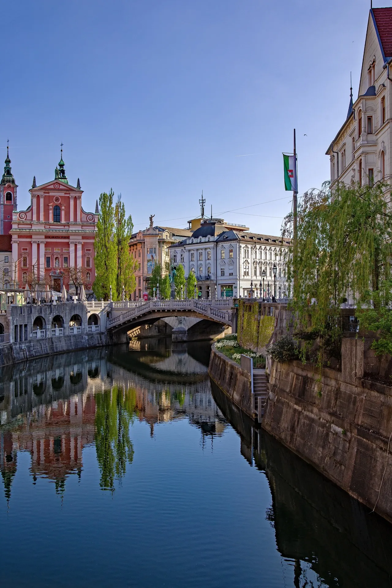 Tromostovje, neboli Trojitý most, je nádherná a ikonická památka v Lublani, Slovinsko. Tři mosty, z nichž jeden byl postaven již v roce 1842, překlenují řeku Ljubljanica před lublananskou radnicí. Další dva mosty byly přidány v roce 1932 a dnes patří mezi oblíbené turistické atrakce. Z hlediska fotografie nabízí most řadu perspektiv a kreativních možností – od dlažbených schodů až po propracovanou barokní architekturu radnice. Kontrast mezi bílými a akvamarínovými zábradlím a fasádami budov je nápadný. Prozkoumejte různé úhly a textury Tromostovje a odmění vás úchvatnými fotografiemi.