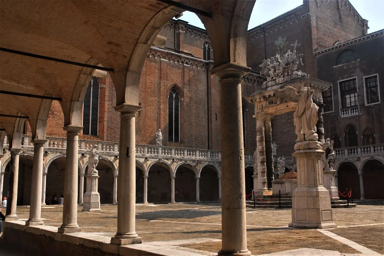Die Basilica di S. Maria Gloriosa dei Frari ist eine römisch-katholische Kirche im Herzen von Venedig, Italien. Sie wurde im 14. Jahrhundert erbaut und ist eine der architektonisch beeindruckendsten Basiliken der Stadt. Die Kirche ist die letzte Ruhestätte von Tizian, dem großen Maler der Renaissance, und spielt eine wichtige Rolle in der Geschichte Venedigs. Im Inneren können die Besucher Renaissance-Kunstwerke, wunderschön gearbeitete architektonische Details und einen hoch aufragenden Altar bewundern. Draußen blickt der riesige Glockenturm auf die kleine Piazza darunter mit ihren gotischen Gebäuden und Kanälen. Dieses Bild ist die Quintessenz Venedigs und bietet ein großartiges Fotomotiv – vergessen Sie nur nicht, die Besucher anzubeten.