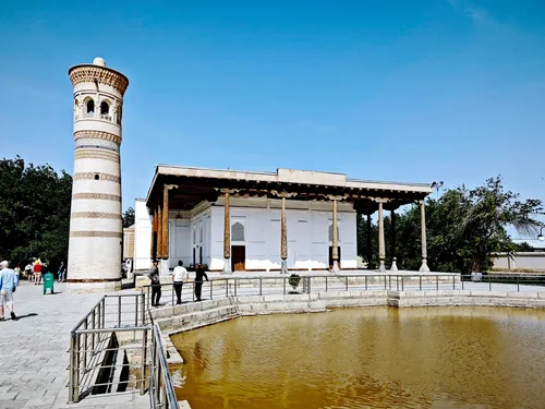 Bibi Orifa xotun, als Mutter des großen Sufi-Heiligen Bahaeddin Naqshband verehrt, empfängt Besucher, die in dem ruhigen Dorf Bogoudin, Usbekistan, spirituelle Verbundenheit suchen. Das schlichte Mausoleum ehrt ihr Erbe, spiegelt traditionelle islamische Architektur und tiefe Andacht wider. Pilger kommen, um Respekt zu zollen und die ruhige Atmosphäre zu erleben, oft kombiniert mit Besuchen nahegelegener heiliger Stätten, die mit Bahaeddin Naqshband verbunden sind. Sanfte Brisen wehen durch den Innenhof und schaffen eine friedliche Umgebung zum Nachdenken und Reflektieren.