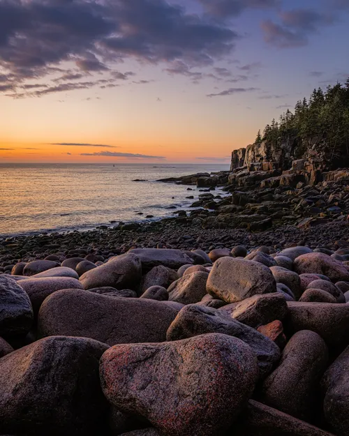 Boulder Beach im Acadia National Park in Bar Harbor ist berühmt für seine markante Küstenlinie aus abgerundeten, von Wellen geglätteten Felsen, die ein wunderschönes Mosaik am Wasser bilden. Der Strand ist besonders faszinierend bei Sonnenaufgang, wenn die aufgehende Sonne die dramatische felsige Küste beleuchtet und die sanften Wellen des Ozeans eine beruhigende akustische Kulisse schaffen. Obwohl das Schwimmen hier aufgrund kühler Temperaturen und starker Strömungen nicht üblich ist, ist der Strand ein idealer Ort zum Fotografieren, Strandspaziergängen und Naturerkundungen. Über die Park Loop Road erreichbar, ist er nur wenige Minuten vom Stadtzentrum Bar Harbors entfernt und bietet einen ruhigen Rückzugsort vom geschäftigen Stadtleben.