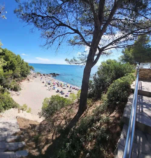 Ruhige Bucht mit goldenem Sand und sanften Wellen, ideal für Reisende, die abseits großer Menschenmengen ein entspanntes Stranderlebnis suchen. Über einen kurzen Weg vom nahegelegenen Wohngebiet erreichbar, lädt die abgelegene Lage zur Entspannung ein und bietet großartige Schnorchelmöglichkeiten zwischen lebendiger Meeresfauna und felsigen Küstenabschnitten. Trotz ihrer Kleinheit gibt es genügend Platz, um ein Handtuch auszubreiten und die warme Mittelmeersonne zu genießen. Grundlegende Annehmlichkeiten wie Duschen und nahegelegene Parkplätze bieten Komfort, während Cafés und Restaurants in Gehweite für ein Essen nach dem Strandbesuch sorgen. Die Küste bleibt in der Regel ruhig und ist familienfreundlich, wobei empfohlen wird, einen eigenen Sonnenschirm mitzubringen.
