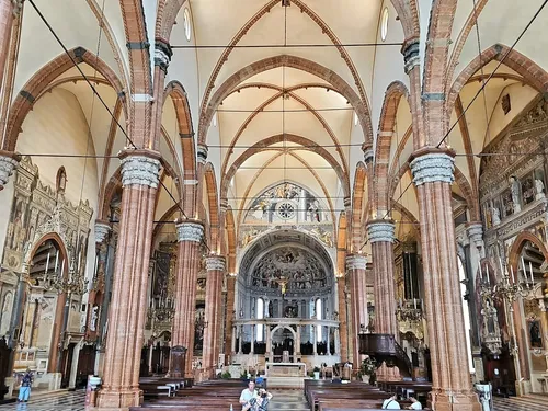 Die Cattedrale di Santa Maria Matricolare, auch bekannt als Veroneser Dom, ist eine beeindruckende Mischung aus romanischen und gotischen Baustilen. Besonders bemerkenswert ist die aufwendige Fassade mit einem Rosettenfenster und kunstvollen Skulpturen, die sie zu einem Traumziel für Fotografen macht. Im Inneren dürfen Sie die schönen Fresken von Francesco Torbido und das atemberaubende Altarbild von Tizian nicht verpassen. Der elegante Kreuzgang der Kirche bietet mit seinen detaillierten, historischen Säulen und üppigem Grün eine ruhige, fotogene Kulisse. Achten Sie auch auf das Taufbecken mit seinem Taufbecken aus dem 12. Jahrhundert, das exquisite Schnitzereien zeigt und sich ideal für Detailaufnahmen eignet. Die Kathedrale ist am frühen Morgen weniger überlaufen, perfekt um ungestörte Fotos zu machen.