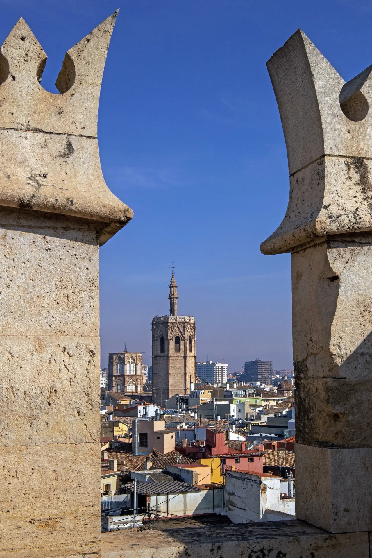 El Micalet ist ein Glockenturm im Zentrum von Valencia, Spanien. Es wurde im 14. Jahrhundert erbaut, ist 51 Meter hoch und bietet von oben einen atemberaubenden Blick auf die Stadt. Der Turm ist über 207 Stufen erreichbar und somit ein großartiger Ort für Fotoreisende, die einen einzigartigen Aussichtspunkt suchen. Es ist auch für seine komplizierte gotische Architektur und die ikonische goldene Kupferfigur der Virgen de los Desamparados an der Spitze bekannt. Der Besuch von El Micalet ist ein Muss für alle, die sich für Geschichte und Architektur interessieren, da es als Symbol für das reiche kulturelle Erbe Valencias gilt. Es liegt außerdem günstig in der Nähe anderer beliebter Touristenattraktionen wie der Plaza de la Reina und der Kathedrale Santa Maria.