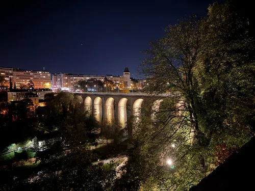 La Passerelle, auch bekannt als der Luxemburger Viadukt, ist eine historische Steinbrücke über das Pétrusse-Tal im Herzen von Luxemburg. Erbaut Mitte des 19. Jahrhunderts, verband sie einst das Stadtzentrum mit dem Bahnhof und bot Panoramablicke auf das grüne Umland. Heute ist sie ein beliebter Ort für Fotografie und Besichtigungen, besonders nahe den malerischen Pétrusse-Parks. In der Umgebung finden Sie den lebhaften Place de la Gare, verschiedene lokale Geschäfte und gemütliche Cafés. Ob beim Überqueren oder aus der Ferne bewundern – die Brücke steht für das architektonische Erbe und die lebendige Kultur der Stadt.
