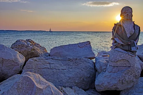 Die Meerjungfrau von Piran ist eine faszinierende Statue an der malerischen slowenischen Küste in Piran, einer Stadt, die für ihren venezianischen Charme bekannt ist. Diese elegante Bronzeskulptur stellt eine Meerjungfrau mit einem Fischbegleiter dar und symbolisiert die bezaubernde Anziehungskraft des Meeres. Am Ende des Piers positioniert, bietet sie spektakuläre Ausblicke auf die Adria, besonders bei Sonnenuntergang, und ist somit ein perfekter Ort für Fotografen, die nach dramatischer natürlicher Beleuchtung suchen. Die umliegende Gegend zeichnet sich durch schmale, gewundene Straßen und historische Architektur aus, die Ihrer fotografischen Reise Tiefe und Charakter verleihen. Nur einen kurzen Spaziergang entfernt befindet sich der Tartini-Platz, benannt nach dem berühmten Geiger Giuseppe Tartini, der eine Mischung aus Geschichte und Küstenschönheit bietet, die es einzufangen gilt.