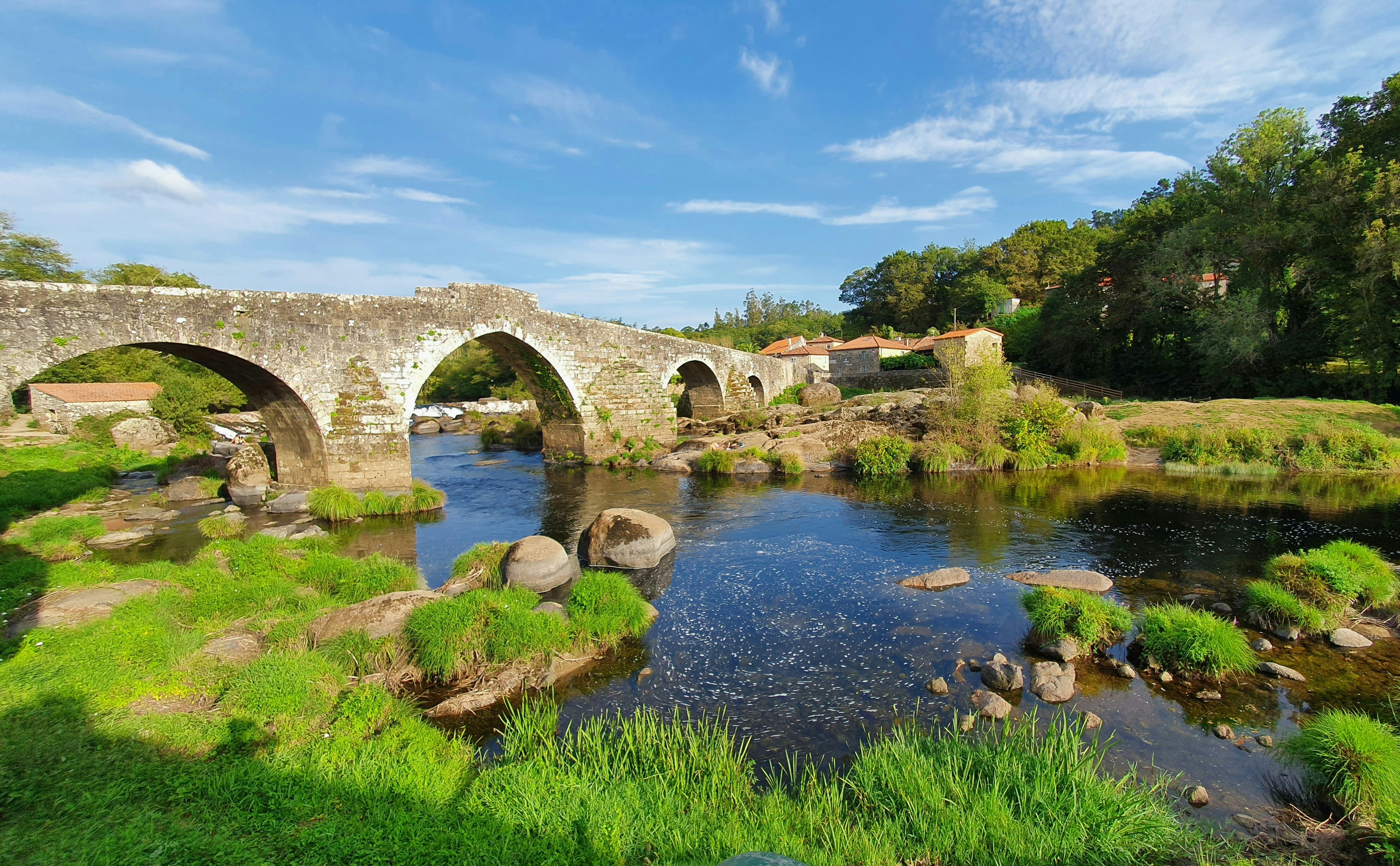 Ponte Maceira ist eine Steinbrücke in Ames, Spanien, am Fluss Tambre. Die ursprüngliche Brücke wurde Mitte des 12. Jahrhunderts erbaut, seitdem aber mehrfach umgebaut. Sie ist derzeit als The Roman Bridge bekannt, obwohl dieser Name ein Anachronismus ist, da er keine römischen Elemente enthält. Die Brücke hat einen einzigen Rundbogen und zeigt zwei Wappen auf dem Mauerwerk, eines mit einem Löwen und das andere mit einem Mörser, Symbole der Ferrol-Dynastie. Obwohl die Ponte Maceira nicht mehr zur Überquerung des Flusses verwendet wird, bietet sie großartige Ausblicke auf das Tambre-Tal, den Himmel bei Sonnenuntergang und das Dorf Ames. Die Brücke ist ein beliebter Ort für Touristen und Fotografen und gilt als Teil des kulturellen Erbes Galiciens.