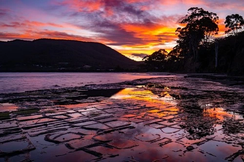Tessellated Pavement ist eine faszinierende Felsformation in der Nähe der Tasmanischen See im Eaglehawk Neck in Tasmanien, Australien. Das Pflaster besteht aus Doleritblöcken, sechseckigen Steinplatten aus erkalteter Lava. Das bemerkenswerte geometrische Muster wird durch blaue und goldene Farbtöne von nahe gelegenen Algen auf der felsigen Oberfläche verstärkt. Vom Holzsteg aus können Sie die malerische Aussicht auf den Aussichtspunkt genießen. Der Zugang zum Gelände ist über den Parkplatz Eaglehawk Neck Lookout möglich, von dem aus Sie den tessellierten Bürgersteig und nahe gelegene Sehenswürdigkeiten wie Tasman's Arch, Devil's Kitchen und Blowhole erkunden können.