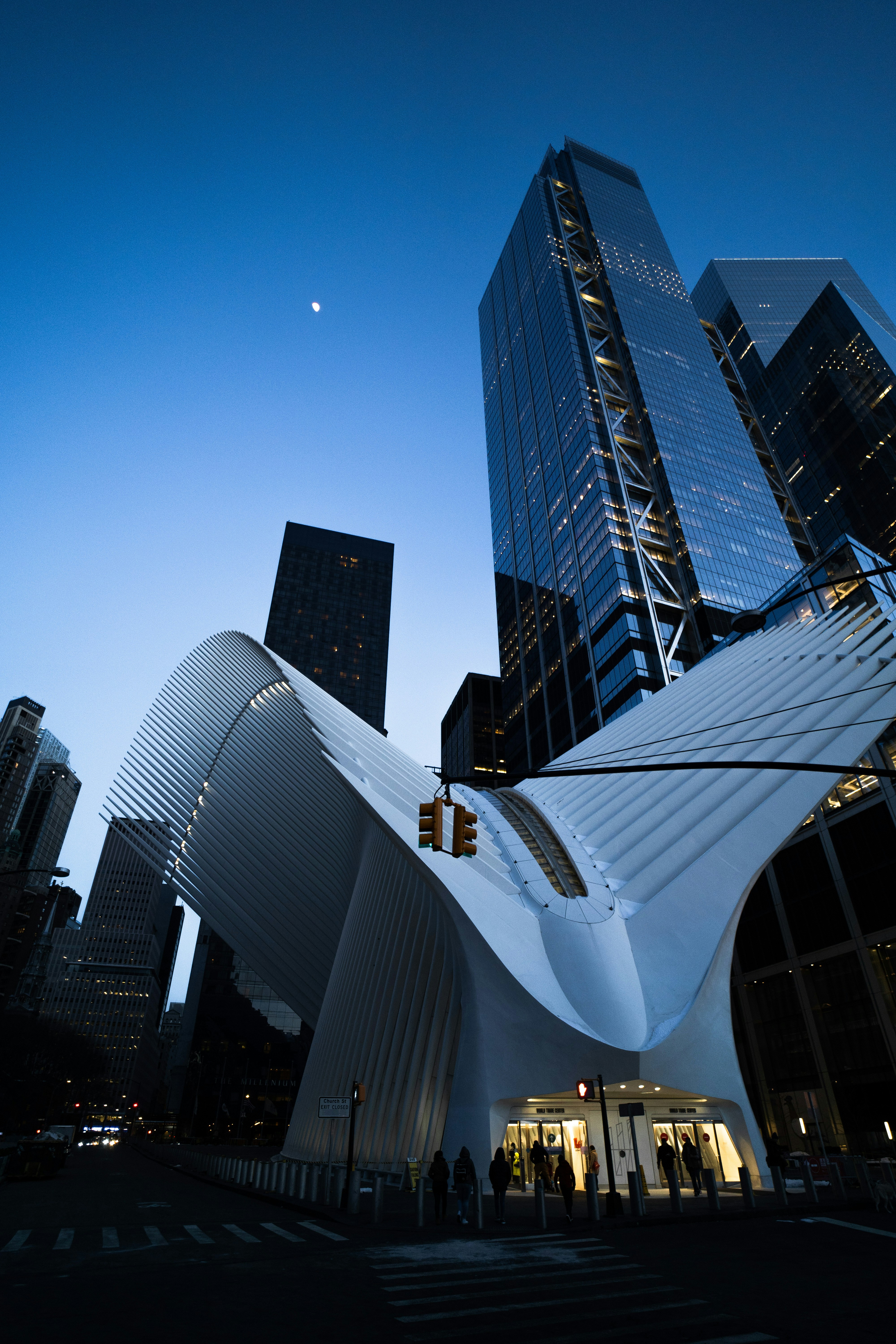 Die Oculus Station in New York, USA, ist ein ikonischer Verkehrsknotenpunkt und ein postmodernes Einkaufszentrum des World Trade Center-Komplexes. Es wurde von dem weltberühmten spanischen Architekten Santiago Calatrava entworfen und erstreckt sich über eine Fläche von 405.000 Quadratfuß. Die massive Struktur besteht aus Stahlrippen, die ein geräumiges Oval bilden, und einem eckigen Glasdach, das natürliches Licht aus den oberen Stockwerken der darüber liegenden Gebäude hereinlässt. Es ist ein wichtiger Knotenpunkt für die PATH-, Airtrain- und Subway-Dienste und bietet Zugang zu den nahe gelegenen Einkaufs- und Unterhaltungskomplexen Westfield World Trade Center und Brookfield Place. Das Oculus ist mit seinem modernen und raffinierten Design zu einem ikonischen Symbol für urbanen Fortschritt und wirtschaftliche Wiederbelebung geworden.