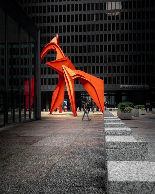 Calder's Flamingo, located in Chicago, United States, is a large-scale public art installation created by artist Alexander Calder. It consists of two pink, abstract, metal structures mounted on a black pedestal that are painted to look like flamingos. The piece has become an iconic symbol of Chicago's diverse public art collection, and is located in the Chicago Park District's Federal Plaza. It has become a popular spot for tourists and locals who come to take photos, view the unique art and admire the amazing juxtaposition of nature and City. The fountain-like structures have views of the Chicago skyline in the background and a variety of plants and trees that provide plenty of photo opportunities.