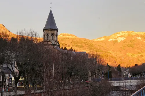The Church of Saint Joseph in La Bourboule is an architectural gem nestled in the picturesque spa town of La Bourboule, in the Auvergne-Rhône-Alpes region of France. Built in the late 19th century, this neo-Romanesque church is characterized by its striking stained glass windows and its robust volcanic stone construction, indicative of the region's geology. Inside, the church boasts an elegant interior adorned with intricate woodwork and beautiful frescoes that reflect the rich religious artistry of the era. Visitors can enjoy the serene ambiance and impressive acoustics, making it a perfect spot for quiet reflection or attending a mass. The surrounding area offers charming streets lined with Belle Époque architecture, thermal spas, and scenic natural landscapes perfect for hiking and relaxation.