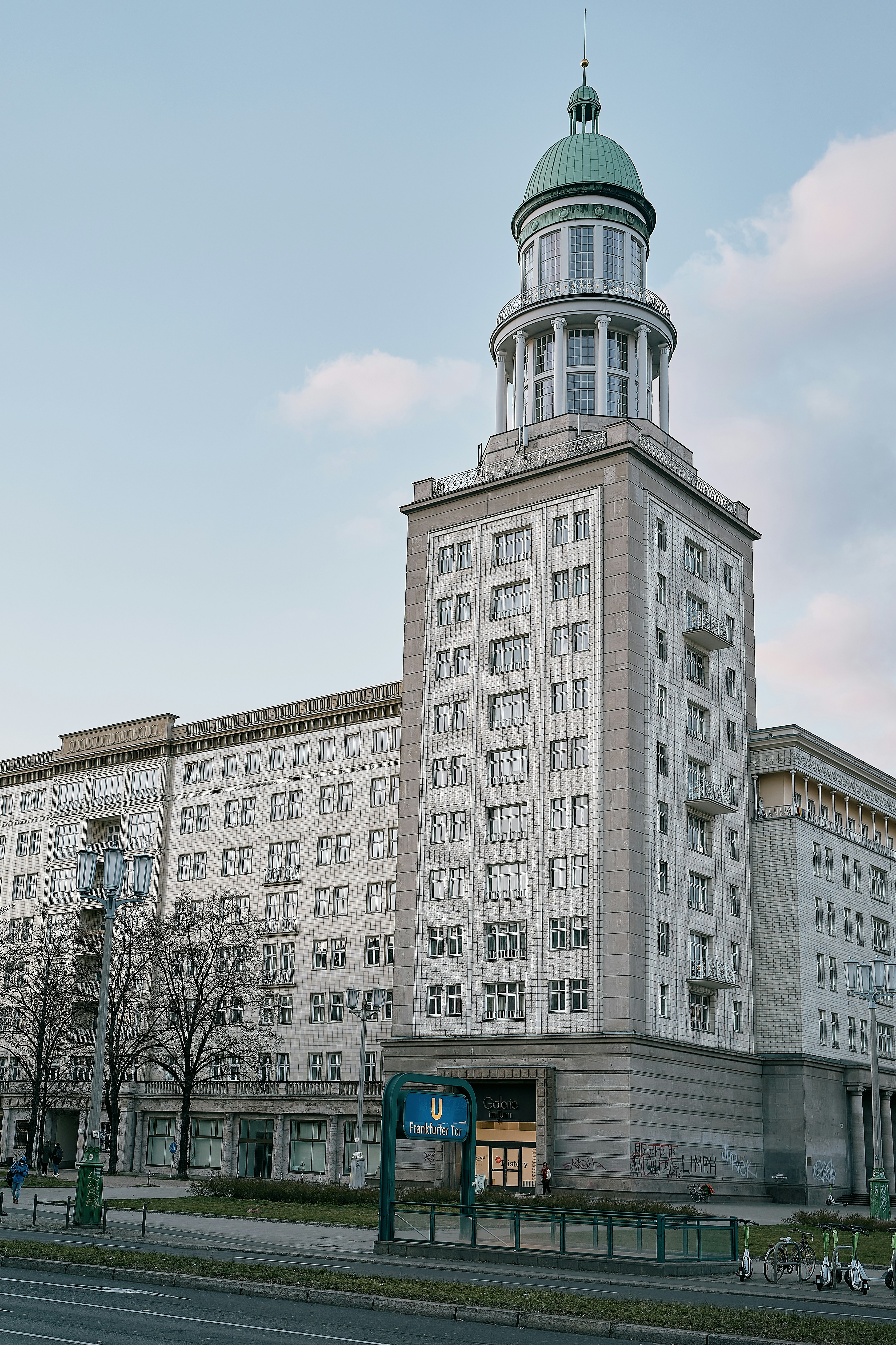 Two iconic towers flank Frankfurter Tor, a key intersection along the storied Karl-Marx-Allee in Berlin’s Friedrichshain neighborhood. Originally constructed in the 1950s as part of East Germany’s monumental socialist boulevard, these green-topped spires evoke Soviet-influenced Neoclassical design. Nearby cafes, bars, and local eateries make it a lively spot to explore day and night, while the wide sidewalks and distinctive architecture create perfect photo opportunities. With U-Bahn access at your doorstep, it’s easy to reach this historical landmark and continue on to discover the vibrant cultural scene of Friedrichshain and its surrounding districts.