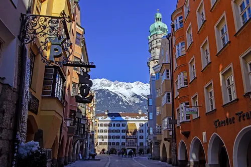 Herzog Friedrich strasse is a quaint cobblestone street in the old city of Innsbruck, Austria. Lined by colorful pastel-hued houses, this is one of Innsbruck's oldest streets, reaching all the way back to the 13th-century. Despite its long history, this street still retains its original character.