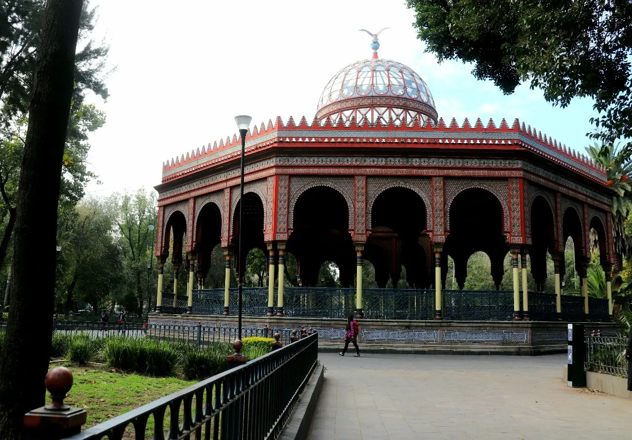 Located in the heart of Mexico City is a traditional and renowned spot loved by photographers and tourists alike: Kiosco Morisco and Alameda de Santa Maria la Ribera. The area has a great weekend pedestrian foot traffic, tourists trying Mexican artisan crafts and street food, an artificial pond surrounded by trees and historical constructions such as an old German cinema and the old French Casino, with ancient benches and chairs deep green vegetation and attractive for the charming mural paintings of artists who come from all parts of the city. This area also has a cultural center called Casa de los Libros, and at night the illuminated fountains cause a unique and picturesque atmosphere.