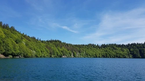 Lac Pavin is a 3-km-wide crater lake in Besse-et-Saint-Anastaise, France. Located in the center of the Sancy Massif mountain range, it is the largest of its kind in the Auvergne region.