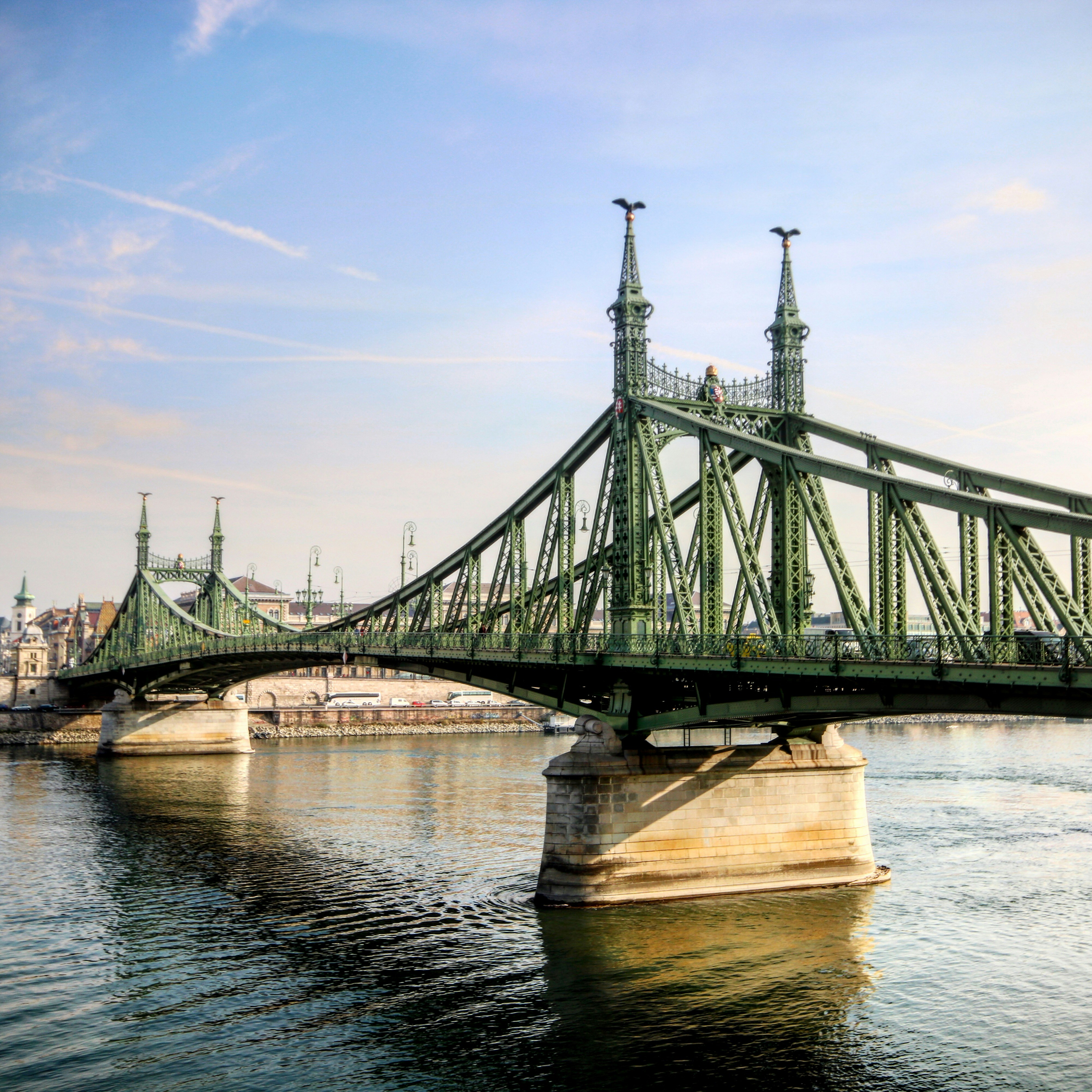 The Liberty Bridge (Szabadság híd) is a bridge built of stone and steel in Budapest, Hungary, across the Danube connecting Buda and Pest. The bridge was opened in 1896, and later rebuilt in structure and design twice. It is the third oldest served bridge of the city and a symbol of the Hungarian nation. It features four tall columns carrying equestrian statues of Hungarian monarchs and baroque lamp-posts between them. It is the most southern bridge of Budapest and it offers spectacular views of the city, the Danube and the neighboring hills. Liberty Bridge is a great spot to take pictures of the sunrise and sunset, lights reflecting off the Danube’s surface and the surrounding monuments, including the Hungarian Parliament, Castle Hill and the Chain Bridge.