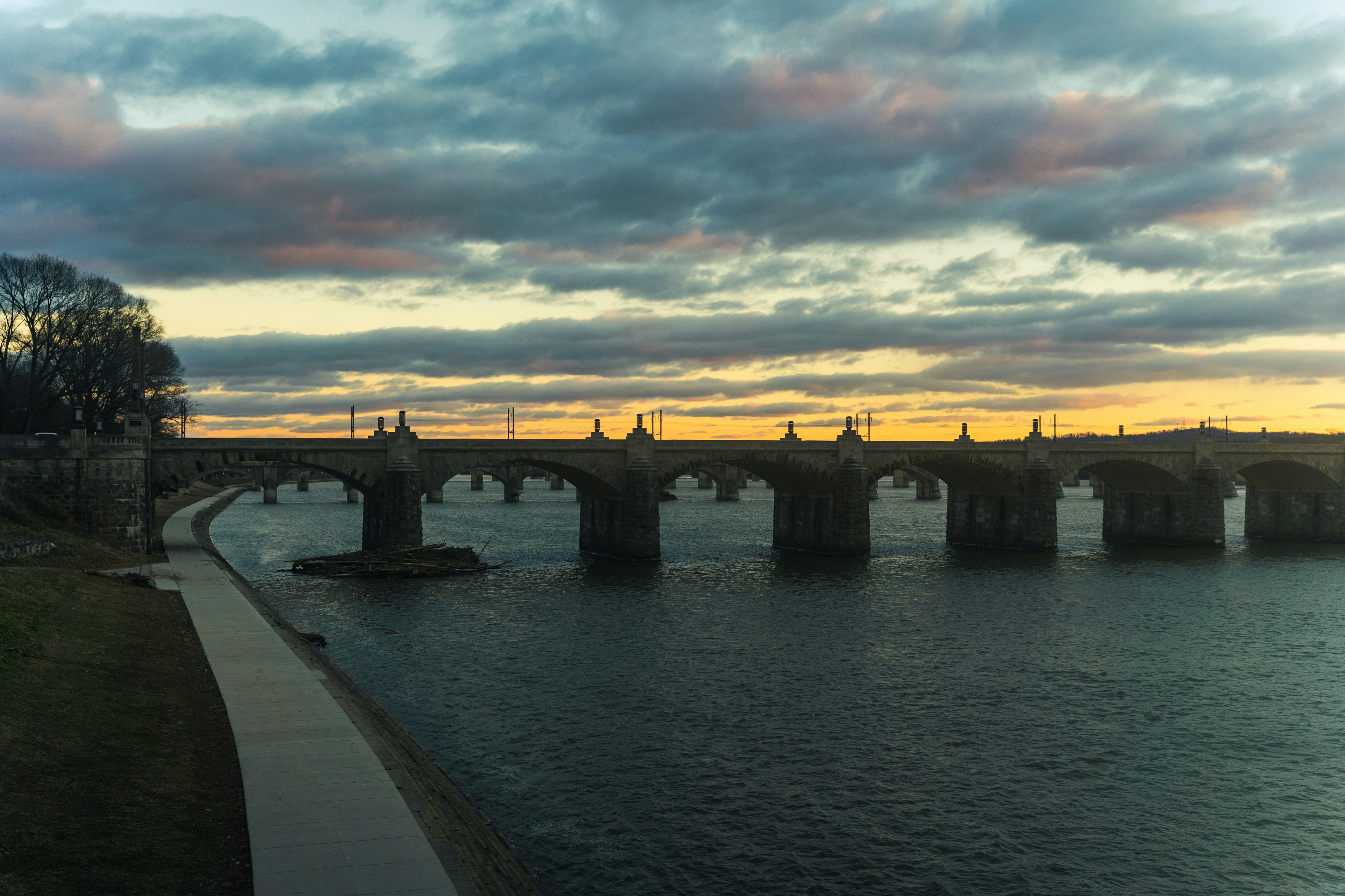 The Market Street Bridge in Harrisburg, US, is a historic bridge from 1902, spanning the Susquehanna River. Located in downtown Harrisburg, its bridge towers painted green reflect nicely against the calm waters. It offers stunning views of both the river and the city skyline, with the historic buildings and structures of Olde Harrisburg illuminated under the bridge at night. It makes a great spot to observe the scenery, relax and take a stroll, or just stop to appreciate the beauty of the Susquehanna River. Access to the pedestrian walkway is located on both the north and south sides of the bridge. This can be a fun and interesting experience for tourists and photographers, to be enjoyed any time of the year.