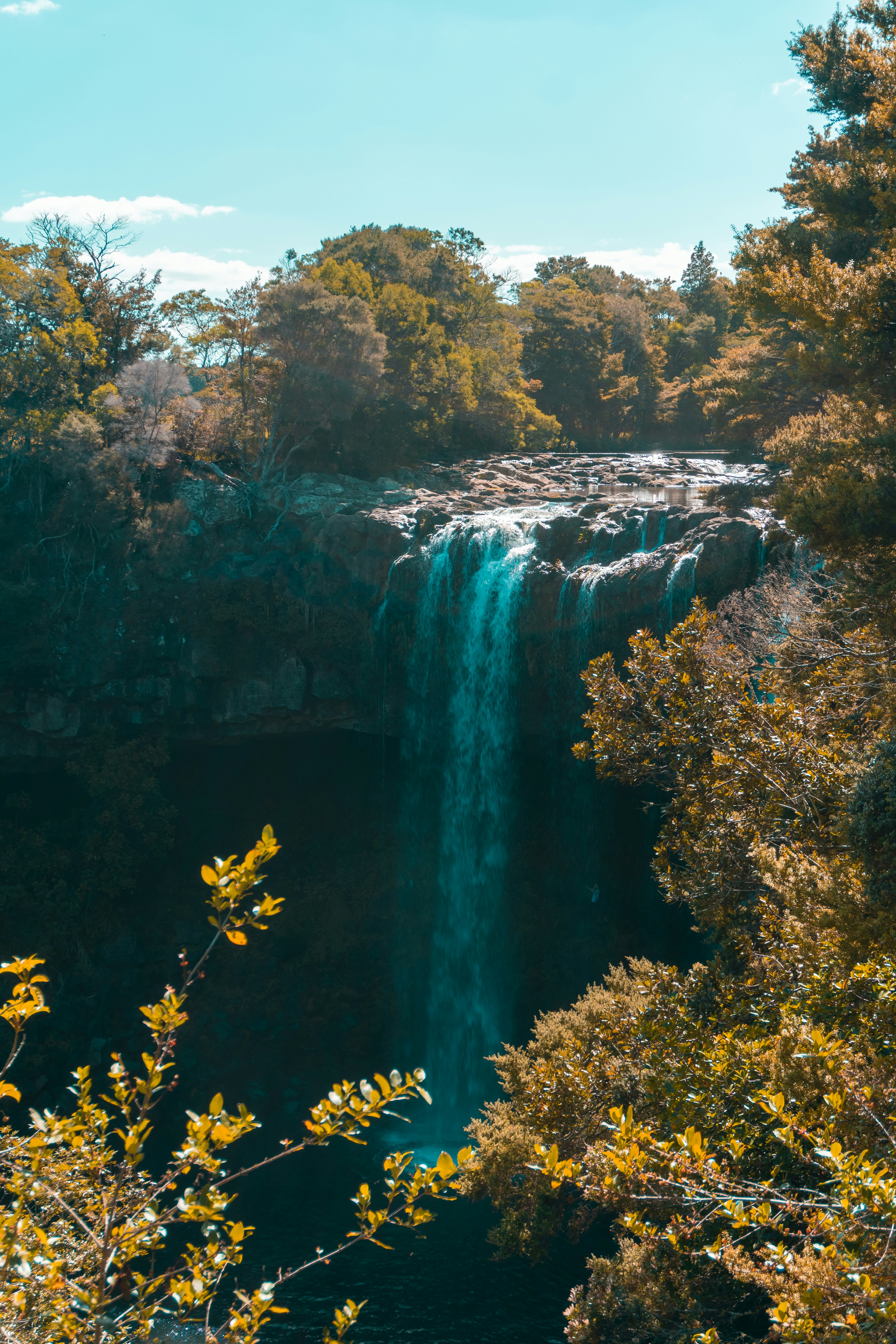 Rainbow Falls is a beautiful waterfall located in Kerikeri, New Zealand. The falls are formed by the Kerikeri River cascading into a deep pool below, creating a stunning sight of splashes and rainbow-like hues. It's a popular and accessible spot for visitors, located conveniently right off the Kerikeri Road. Even though a small carpark is provided, you can also go by foot. A wooden platform is provided to capture the majestic view of the falls. In the summer months, you can take a dip in the pool and even swim against the current of the powerful falls! Have your camera ready to capture the spectacular natural beauty of Rainbow Falls.