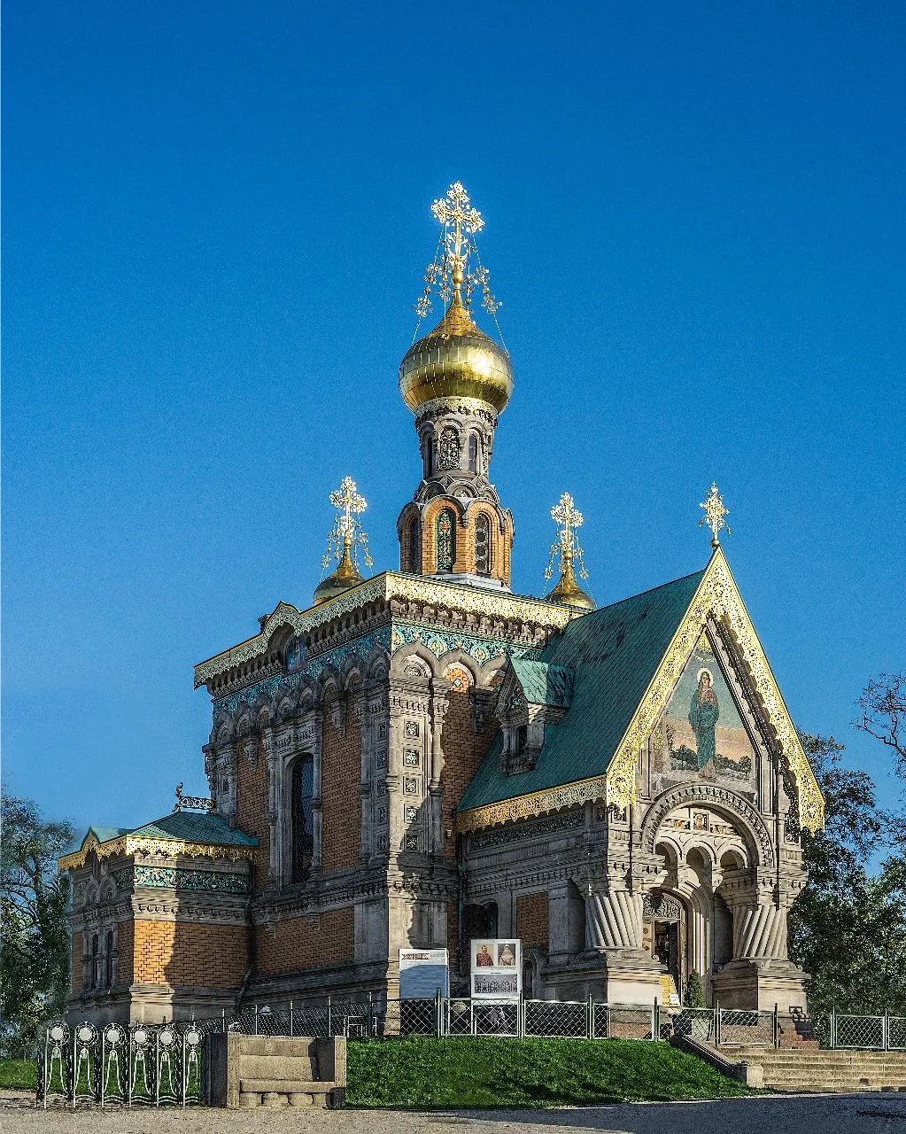 The Russian Orthodox Church of St Maria Magdalena in Darmstadt, Germany, is a picturesque sight and a popular pilgrimage destination. The church was built in 1749 and has a baroque style. High ceilings, Russian-style domes, and green and white outer walls complete the church's beauty. Inside, visitors will find an impressive, large iconostasis, icons, and numerous other religious relics and artifacts. Visitors can also explore the richly decorated chapel, which has been added to the church in 1912. The church grounds are a tranquil refuge for travelers looking to enjoy nature, featuring a grassy courtyard, a pond, and a few trees. Please respect that this is an active religious building and take off shoes and cover shoulders when entering. Photography is welcomed, but keep in mind that some areas may be off limits. Come have a peaceful and reflective visit.