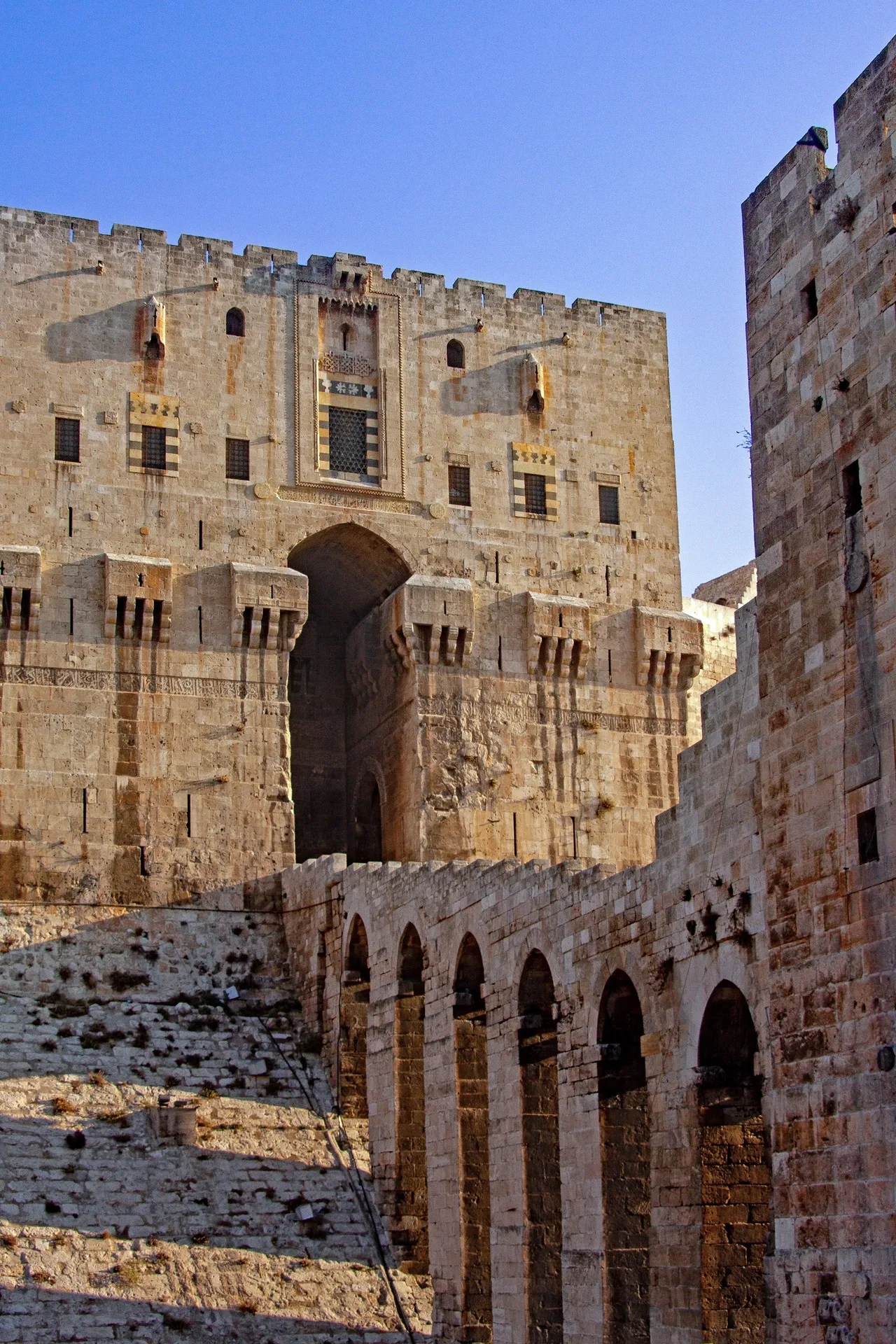The Main Entrance of The Citadel of Aleppo, a monumental fortified gate, features a majestic bridge flanked by towers with imposing defensive architecture. Noteworthy for its striking Mamluk-era iron doors and heavy stone masonry, the citadel’s entrance is adorned with intricate stone carvings and inscriptions. Its unique defense mechanisms include a bent entrance that disrupts invaders’ direct approach. For photography, capture the interplay of light and shadow on the weathered walls around sunset for dramatic effects. The entire structure offers a rich tapestry of textures and historical layers, making it a compelling focal point for architectural photography. Secure permission if required, as the site has been affected by current events and may have restrictions.