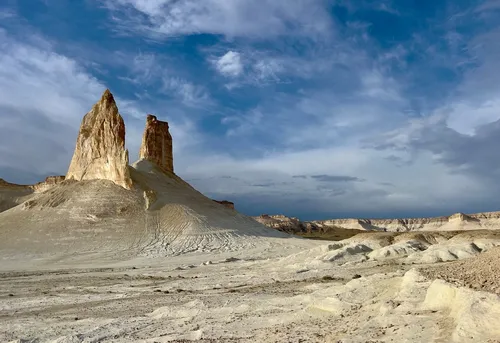 Urochishche Bozzhyra, nestled in the vast Mangystau region of Kazakhstan, sits exquisitely isolated, offering landscapes that feel more extraterrestrial than terrestrial. This untouched natural wonder is celebrated for its dazzling white chalk cliffs and uniquely sculpted rock formations, which rise dramatically from the desert floor. For photo-travelers, the area serves as a canvas of surreal beauty, particularly captivating at sunrise or sunset when the light paints the formations in soft hues of pink, orange, and gold. The remotest reaches of Bozzhyra, including the iconic twin peaks, provide unparalleled backdrops for photography. Access involves a journey through remote trails, emphasizing the need for a 4WD vehicle and potentially a local guide to navigate the terrain safely. The absence of facilities underscores its unspoiled charm, so visitors should come well-prepared with supplies and respect the fragile ecosystem. Seasonally, the area can experience extreme temperatures, thus planning around early morning or late afternoon excursions can yield the most comfortable and visually rewarding experiences.