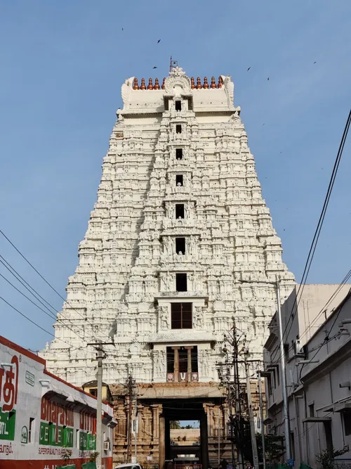Vellai Gopuram, also known as the White Tower, is a prominent and visually striking entrance gate to the Srirangam Temple in Tiruchirappalli, India. It stands out for its brilliant white facade, which contrasts sharply with the richly colored surroundings. Built during the Vijayanagara period, this gopuram features intricate carvings and ornate sculptures that beg for high-resolution photography. Lighting is best early in the morning when the sun casts a soft glow, accentuating the details. The gopuram is less crowded at this time, allowing for clearer shots. Ensure your camera has a wide-angle lens to capture the full height and grandeur in one frame.