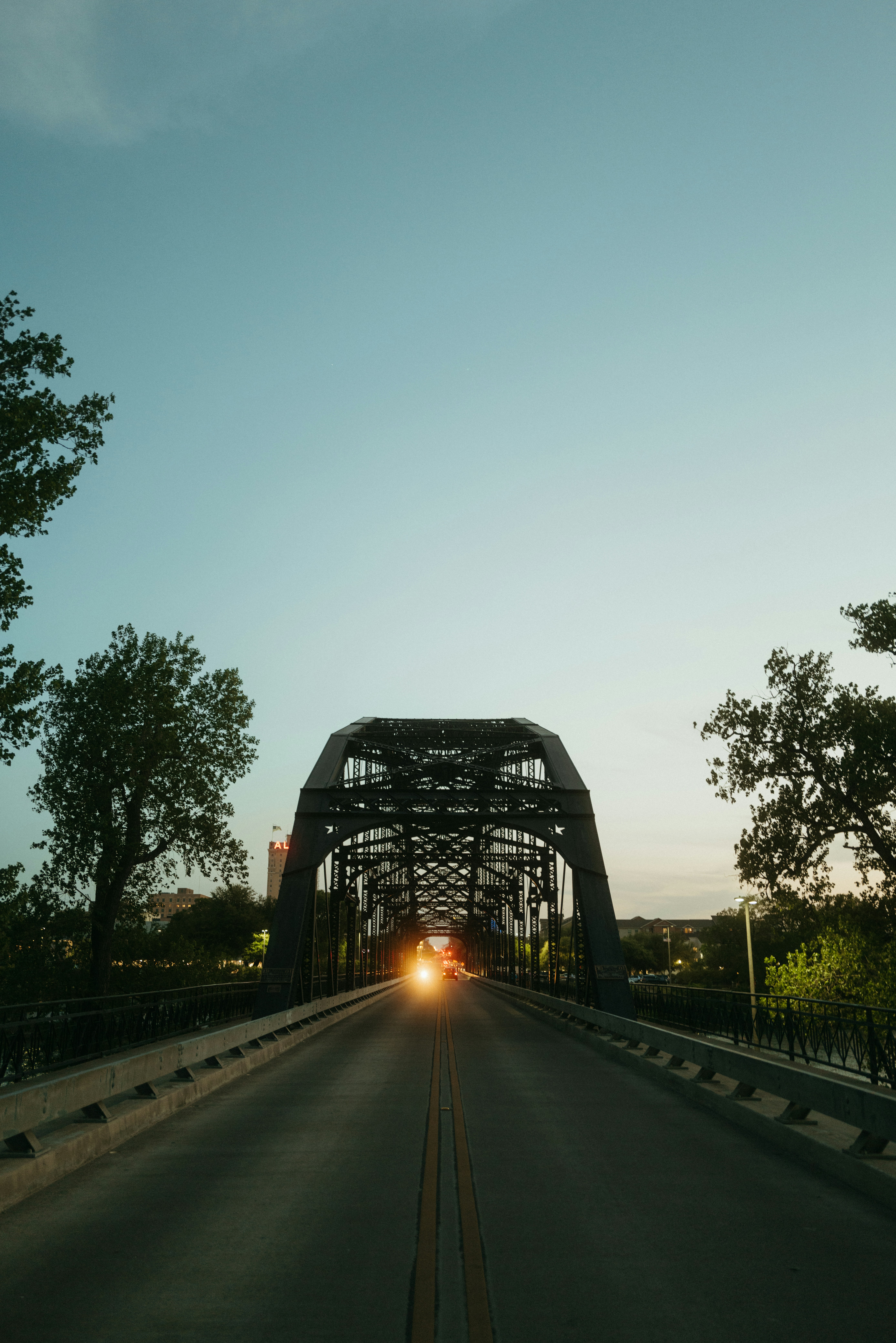 The Washington Avenue Bridge in Waco, Texas, is an iconic landmark. Spanning the Brazos River, it was built in the Art Deco style in 1933-34. It is constructed of steel trusses with a total length of 1,310 feet, with a main span of 565 feet. 52 painted steel beams of varying colors grace the trusses, forming an arcade along the sides. The bridge was listed in the National Register of Historic Places in 1989 and its garden-like setting along the river provides a pleasant view for pedestrians. The river banks are a popular spot for picnics and fishing. An observation deck near the middle of the bridge provides panoramic views of the city. Biking and walking paths traverse the bridge, linking Waco’s businesses and neighborhoods to the river. The bridge is well illuminated for nighttime photography. The colors, textures and historic nature of the bridge also make it a popular subject during the day.