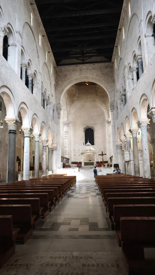 Un ejemplo destacado de la arquitectura románica apulense, la Basilica Cattedrale Metropolitana Primaziale San Sabino se encuentra en el corazón del casco antiguo de Bari. Construida entre finales del siglo XII y principios del XIII, su fachada de piedra caliza blanca luce una prominente roseta y portales decorados esculpidos. En su interior, bóvedas resplandecientes, columnas elegantes y capillas ricamente adornadas conducen a los visitantes hacia la cripta, donde se conservan reliquias de San Sabino. La catedral ha sido cuidadosamente restaurada, preservando su autenticidad histórica y su aura espiritual. Su ubicación central en Bari Vecchia ofrece fácil acceso a restaurantes cercanos, callejuelas pintorescas y el vibrante paseo marítimo de la ciudad.