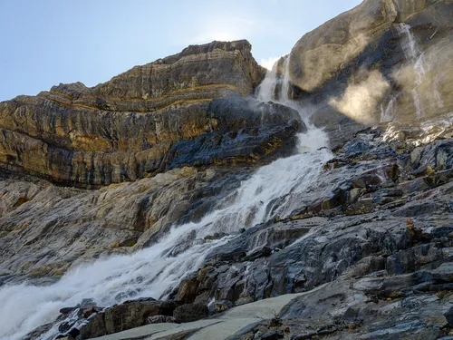 Bow Glacier Falls es una cascada pintoresca enclavada en el corazón de las Montañas Rocosas Canadienses, donde las aguas glaciares se precipitan en medio de un terreno montañoso accidentado. La cascada recibe agua de deshielo del Glaciar Bow, creando un brillante despliegue de tonos turquesa que varían con la luz durante el día. Accesible a través de un sendero de dificultad moderada, se recompensa a los visitantes con vistas panorámicas de praderas alpinas, picos imponentes y cañones profundos. Ideal para los amantes de la naturaleza y la fotografía, el área también ofrece oportunidades para observar la fauna silvestre y disfrutar de tranquilos picnics, aunque se recomienda llevar un calzado adecuado y estar preparado para condiciones meteorológicas variables.