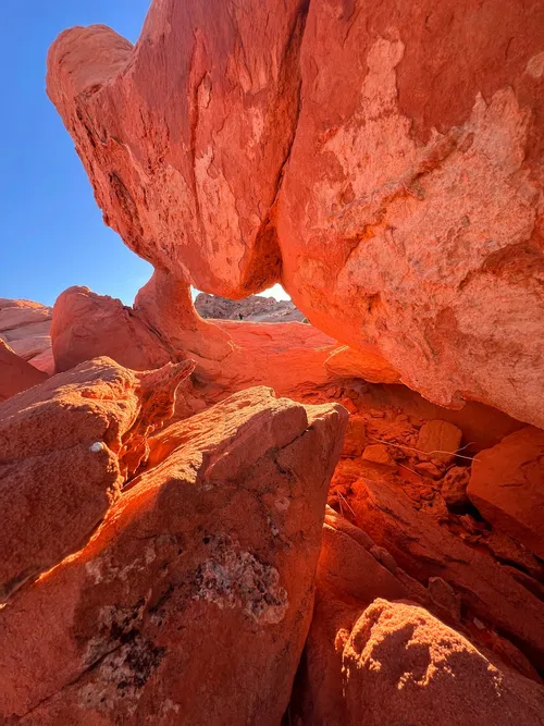 La roca se encuentra dentro del Parque Estatal Valle del Fuego, conocido por sus vibrantes formaciones de arenisca roja y paisajes únicos. Es fácilmente accesible desde la carretera principal y los visitantes pueden caminar hasta la base de la roca para verla más de cerca y tomar excelentes fotografías. Además de su parecido con un elefante, Elephant Rock ofrece impresionantes vistas del paisaje desértico circundante, especialmente durante el amanecer y el atardecer. Los tonos cálidos de la arenisca de la roca la convierten en un lugar ideal para los amantes de la fotografía. La mejor manera de experimentar Elephant Rock es haciendo una caminata por el Parque Estatal Valle del Fuego. El parque ofrece varios senderos bien señalizados que van desde niveles de dificultad fácil a moderado, que permiten a los visitantes conocer de cerca la roca y sus alrededores. Para aquellos que buscan más aventuras, la escalada en roca también es una actividad popular en Elephant Rock. Sin embargo, se requiere equipo y experiencia adecuados para garantizar la seguridad. Montar a caballo y acampar también son actividades populares en la zona. Si planea visitar Elephant Rock, asegúrese de llevar mucha agua y protección solar, ya que el área puede hacer mucho calor y hay poca sombra. Además, asegúrese de cumplir con todas las reglas y regulaciones del parque para preservar la belleza natural del sitio. En conclusión, Elephant Rock en Moapa Valley, Estados Unidos, es un destino de visita obligada para viajeros y fotógrafos que buscan capturar la impresionante belleza de la naturaleza. Con su formación rocosa única y sus impresionantes vistas, seguramente dejará una impresión duradera en todos los que la visiten.