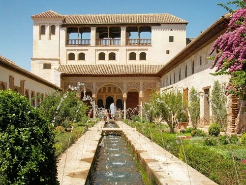 El Generalife es un hermoso jardín árabe paradisíaco ubicado a las afueras de la Alcazaba de Granada, España. El nombre "Generalife" significa "jardín del arquitecto" y es uno de los jardines moriscos más antiguos del mundo. Los jardines han sido cuidadosamente restaurados a su antigua gloria y ofrecen un entorno tranquilo para pasear y escapar del ajetreo y el bullicio de la ciudad. Los jardines están llenos de palmeras y árboles frutales, arbustos exóticos y fuentes burbujeantes rodeadas de pintorescos caminos de piedra. En días despejados, la vista de las montañas nevadas de Sierra Nevada al fondo agrega un toque especial a la experiencia. Hay varios patios para explorar y admirar el diseño de los arcos y los detalles intrincados de los balcones, pasillos y patios. Mientras los visitantes deambulan por los senderos del jardín, pueden apreciar el ambiente sereno y la belleza de este histórico sitio declarado Patrimonio de la Humanidad por la UNESCO. ¡Da un paseo y admira las impresionantes vistas de los jardines del Generalife!