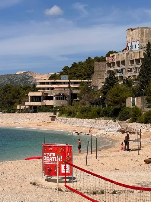 Una bahía pintoresca con aguas calmadas, la playa Kupari ofrece un escape sereno en la Riviera de Dubrovnik. Rodeada de vestigios de hoteles abandonados dañados durante la Guerra de Independencia de Croacia, crea una atmósfera única y algo inquietante que mezcla historia y belleza natural. Su ubicación cerca de Dubrovnik facilita el acceso en autobús o coche, y su suave orilla es ideal para familias y nadadores de todos los niveles. A veces hay tumbonas y sombrillas, mientras que los cafés y restaurantes locales satisfacen el hambre tras un día en el mar. Recorre la orilla para vislumbrar el antiguo complejo hotelero, pero ten cuidado con las áreas restringidas.