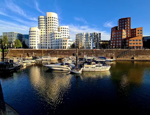 Se puede acceder fácilmente a los tres edificios, cada uno con su propia forma y color, en transporte público o a pie. La parada de tranvía más cercana es "Neuer Zollhof". El área que rodea los edificios ofrece impresionantes vistas del río Rin y del horizonte de la ciudad, lo que lo convierte en un excelente lugar para tomar fotografías. Los visitantes pueden realizar una visita guiada por los edificios para aprender más sobre su diseño e historia, o simplemente pasear y admirar las impresionantes estructuras desde el exterior. Los edificios albergan oficinas y negocios, así que tenga cuidado con los trabajadores durante la semana. Neuer Zollhof también alberga varios restaurantes y cafeterías, que ofrecen una variedad de cocinas y opciones para sentarse al aire libre con vistas a los edificios. Esto lo convierte en un gran lugar para comer algo mientras admira la arquitectura. Por la noche, los edificios están bellamente iluminados, creando un impresionante telón de fondo para fotografías nocturnas. La zona también alberga eventos y festivales durante todo el año, lo que aumenta su ambiente animado. En general, Neuer Zollhof es un destino de visita obligada para viajeros y fotógrafos en Düsseldorf. Su arquitectura única, su ubicación pintoresca y su atmósfera vibrante lo convierten en un lugar perfecto para capturar fotografías impresionantes y experimentar el encanto moderno de la ciudad.