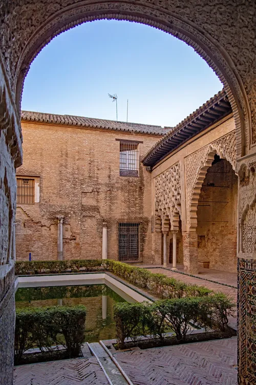 Patio del Yeso es una de las secciones más antiguas del Real Alcázar, con impresionante arquitectura almohade del siglo XII. Su nombre hace referencia al delicado estuco que adorna las paredes, donde motivos geométricos y caligrafía árabe reflejan el legado moro del palacio. Enmarcado por esbeltas arcadas, un estanque tranquilo se ubica en el centro, creando una atmósfera serena perfecta para pausas entre recorridos. La luz que ingresa destaca las elaboradas tallas, apreciables a un ritmo pausado. La fotografía aquí capta rincones silenciosos, a menudo ignorados en los patios más grandes, haciendo de este rincón oculto el favorito de los amantes de la historia y la arquitectura.