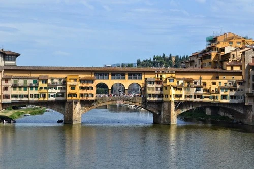 Descubra el encanto mágico del emblemático punto italiano de Ponte Vecchio en Florencia. Construido en 1345, el Ponte Vecchio es el puente más antiguo de la ciudad y una vista única en el corazón de Florencia. El puente, que está hecho de piedra, fue construido originalmente para albergar tiendas y puestos de comerciantes locales. Hoy en día, alberga una gran variedad de joyerías de alta gama, tiendas de souvenirs y cafeterías. Aquí podrás caminar entre el reflejo luminoso del oro amarillo y las gemas blancas, mientras disfrutas de la vibrante atmósfera del Ponte Vecchio. Aquí podrá explorar las tiendas tradicionales, admirar su exquisita artesanía y encontrar su próxima posesión preciada. Disfrute del sol de la mañana bañado por el río Arno, pasee por el puente y disfrute del paisaje mediterráneo con espectaculares vistas del horizonte de Florencia. Ponte Vecchio es un lugar de belleza, historia y cultura, lo que lo convierte en una experiencia que no debe perderse.