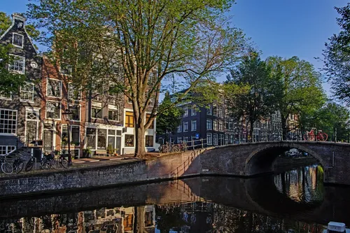 El Puente Reguliersgracht es conocido por su vista de postal con siete arcos de canal consecutivos. De noche, los puentes iluminados crean una escena encantadora, especialmente durante un paseo en barco. El barrio ofrece arquitectura atractiva, casas centenarias y cafés acogedores para descansar entre aventuras turísticas. Pasea por las calles cercanas para descubrir boutiques y patios secretos llenos de encanto local. Por su importancia histórica y ambiente romántico, este puente es popular para fotos y momentos de reflexión. Ubicado cerca de Rembrandtplein, es accesible a pie, en bicicleta o tranvía, siendo el punto ideal para explorar los canales de Ámsterdam y atracciones cercanas.