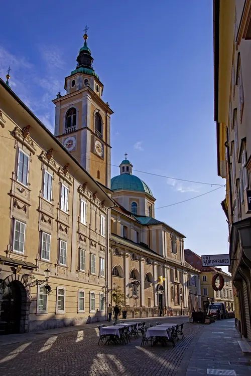 La Catedral de San Nicolás, también conocida como la Catedral de Liubliana, es una impresionante iglesia barroca y un importante hito arquitectónico en Liubliana, Eslovenia. Conocida por su distintiva cúpula verde y sus torres gemelas, los orígenes de la catedral se remontan al siglo XIII. La estructura actual se completó a principios del siglo XVIII, y presenta interiores ricamente decorados, que incluyen intrincados frescos de Giulio Quaglio, con vívidas representaciones de San Nicolás. Las cautivadoras puertas de bronce, elaboradas en honor a la visita del Papa Juan Pablo II, están adornadas con relieves escultóricos que ilustran la historia cristiana de Eslovenia. La posición de la catedral cerca del bullicioso Mercado Central y de los pintorescos puntos de referencia de la ciudad la hace especialmente atractiva para los fotógrafos.