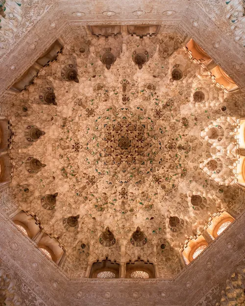 El "Techo de la Sala del Patio de los Leones" en Granada, España, es un exquisito ejemplo de arte y arquitectura islámicos dentro del palacio de la Alhambra. Este techo representa el cenit del arte nazarí y muestra una intrincada estructura de cúpula de madera que simboliza los siete cielos de la cosmología islámica. Los entusiastas de la fotografía encontrarán un impresionante caleidoscopio de mocárabes (decoraciones similares a estalactitas) que crean un efecto 3D, que resulta especialmente impresionante en condiciones de luz cambiantes a lo largo del día. El juego de luces y sombras, combinado con la complejidad geométrica, ofrece oportunidades fotográficas únicas. Capture tomas desde múltiples ángulos para enfatizar la profundidad y el detalle de la artesanía. Tenga en cuenta que la iluminación interior puede ser tenue, por lo que lo ideal sería una cámara capaz de manejar situaciones de poca luz o una lente con una gran apertura. Este sitio no sólo ofrece un festín visual sino también una visión profunda de la sofisticación de la estética islámica medieval.