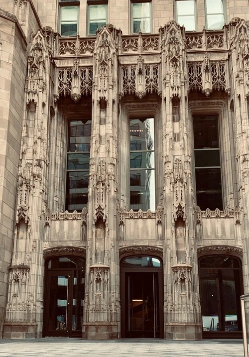Tribune Tower en Chicago, Estados Unidos, es un impresionante edificio de estilo gótico que se completó en 1925. Con una altura de 141 m (462 pies), es una parte icónica del horizonte de Chicago y fue nombrado Monumento Histórico del Instituto Americano de Arquitectos en 1989. La torre contiene piedras de estructuras icónicas del mundo, como la Gran Pirámide de Egipto, la Gran Muralla China, Santa Sofía de Estambul, el Taj Mahal y el Partenón. Los visitantes pueden ir al vestíbulo del edificio para ver algunas de estas piedras por sí mismos. El público también puede contemplar las impresionantes vistas de la ciudad desde lo alto de la torre. El área alrededor de la torre es vibrante, con ajetreo y bullicio del público, tiendas, restaurantes y más. Las hermosas fachadas de Tribune Tower son visibles desde lejos, lo que la convierte en un destino de visita obligada tanto para turistas como para viajeros.