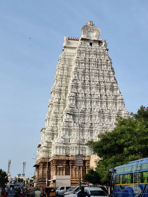 Vellai Gopuram, una puerta exquisita del Templo Sri Ranganathaswamy en Srirangam, Tiruchirappalli, India, es la segunda entrada en el lado sur. Conocida por su impresionante fachada blanca, contrasta maravillosamente con la arquitectura dravídica ricamente detallada típica del templo. El gopuram ofrece excelentes oportunidades para capturar intricados trabajos en estuco y delicadas tallas representativas del arte del siglo XIV. Visita durante la mañana temprano o al final de la tarde para obtener una iluminación natural óptima. Dado que es obligatorio quitarse los zapatos, lleva calzado ligero. La fotografía dentro del complejo del templo está generalmente restringida, así que enfócate en tomas exteriores. Una subida sin prisas por las estructuras circundantes puede ofrecer una vista panorámica de este majestuoso edificio.