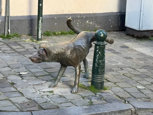 Zinneke Pis es una encantadora escultura de perro instalada en 1998 por el artista Tom Frantzen, que muestra a un cachorro de bronce levantando la pata para "aliviarse" contra un poste. Ubicada en la intersección de la Rue des Chartreux y la Rue du Vieux Marché aux Grains, suele pasar desapercibida frente a sus contrapartes más famosas, Manneken Pis y Jeanneke Pis. Los locales llaman "Zinneke" a los perros callejeros, reflejando el espíritu juguetón y el patrimonio multicultural de Bruselas. Ideal para una foto rápida, ofrece una mirada desenfadada a la escena artística humorística de la ciudad. Agrégala a tu ruta a pie y descubre un monumento peculiar que celebra el encanto único de Bruselas.