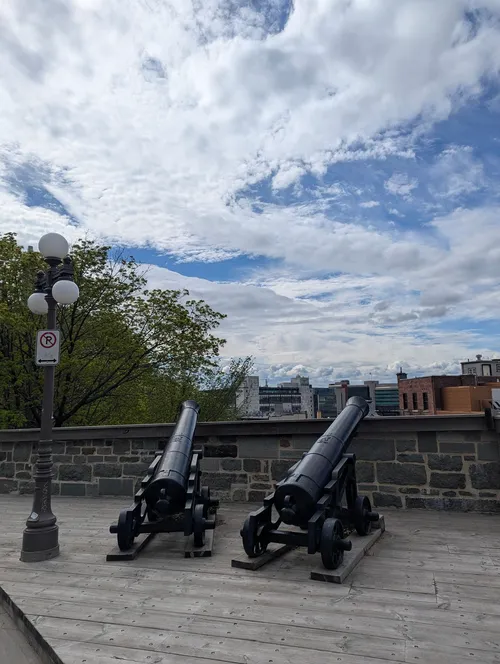 Des canons historiques bordent la pittoresque rue des Remparts, retraçant des siècles d'histoire militaire au cœur du Vieux-Québec. Installées le long des fortifications, ces reliques de fer défendaient autrefois les hauteurs stratégiques surplombant le fleuve Saint-Laurent. Une promenade le long des remparts offre une vue imprenable sur le Bas-Québec et la campagne environnante, idéale pour la photographie. Des panneaux d'interprétation éclairent les conflits coloniaux et l'évolution des défenses de Québec. Visitez de préférence pendant les mois chauds pour une exploration aisée, même si le paysage hivernal enneigé apporte une ambiance féerique. Ne manquez pas de profiter des cafés et boutiques locaux à quelques pas.