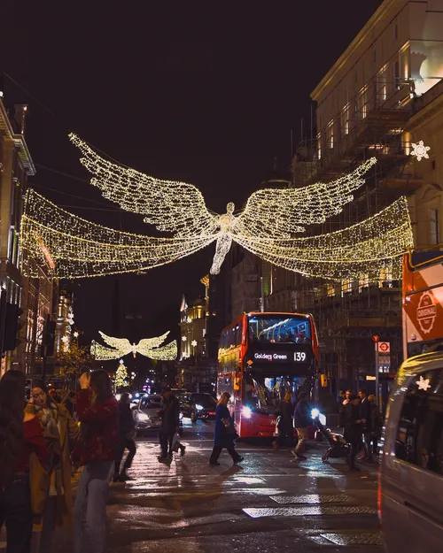 L'esprit de Noël sur Regent Street est célèbre pour son magnifique éventail de lumières de fête, souvent considéré comme l'un des plus emblématiques de Londres. En tant que première rue du centre de Londres à présenter des illuminations de Noël depuis 1954, elle attire d'innombrables photographes grâce à ses beaux anges suspendus qui illuminent la rue avec des lumières LED économes en énergie, mettant en valeur l'architecture grandiose des bâtiments historiques de Regent Street. Pour les meilleures opportunités de photos, visitez pendant le crépuscule quand le mélange de lumière naturelle et artificielle offre des contrastes captivants. Envisagez de réaliser des prises de vue à longue exposition pour mettre en avant les lumières scintillantes et l'animation de la rue. Préférez y aller en semaine pour éviter les foules denses qui se rassemblent les week-ends.