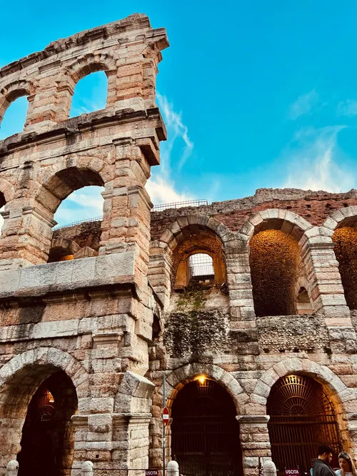 Az Arena di Verona, az ősi római amfiteátrum, Veronába gazdag történelmi örökségének tanúja, az 1. századból. Fotótúrázóknak kötelező megörökíteni az egyik legjobban megőrzött ókori építményt. Az ellipszis alakú aréna számtalan dinamikus szöget kínál, különösen arany- és kékóra idején, amikor a lemenő nap vagy a korai alkony meleg, éteri fényt kölcsönöz az ősi kőnek. Az aréna nem csupán emlékmű, hanem események színtere is, legkiemelkedőbben a nyári Veronai Operafesztivál, ahol a történelmi építészet és az élő előadások csillagfényes ég alatt egyedi fotózási lehetőségeket teremtenek. A belső tér, a rétegezett boltívek és hatalmas ülőterület felfedezése erőteljes képeket eredményez, amelyek visszaadják ennek az ókori helynek a méretét és hangulatát. A kora reggelek ideálisak az Arenát tömeg nélkül megörökíteni, tisztább, fókuszált felvételekhez.