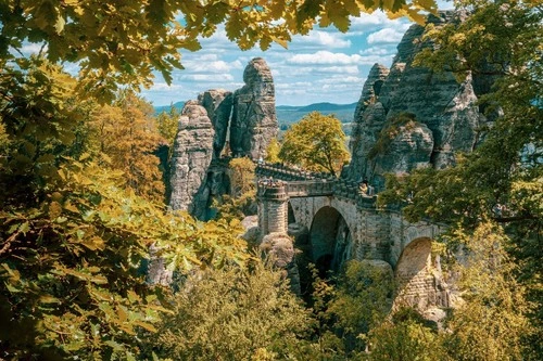 A Basteibrücke („Bastionhíd”) egy homokkőből készült ívhíd a Szász-svájci Nemzeti Parkban, közel Lohmenhez, Németországban. A hidat 1824-ben építették, és lélegzetelállító kilátást nyújt a környező hegyekre, sziklafalakra és szurdokra. 275 láb hosszú és 179 láb magas. A túrázók körében népszerű, és egy hosszabb ösvény része a park peremén, így lehetővé teszi a térség természetének és kultúrájának felfedezését. A kerékpározás, gyaloglás és szikmászás is elterjedt ezen a területen a közeli hegy- és sziklaképződmények miatt. Ha fotókat keresel, a legjobb idő a gyenge fényviszonyok – napfelkelte és napnyugta – ideje.