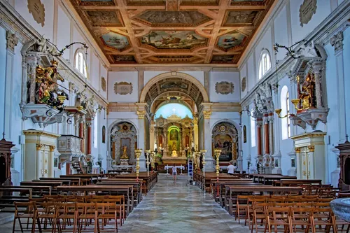 Di dalam Duomo di San Giorgio di Piran, Slovenia, Anda akan menemukan perpaduan luar biasa antara pengaruh Venesia dan Barok. Interior gereja dihiasi dengan altarpiece dan fresco rumit yang dibuat antara abad ke-17 dan ke-18, menyuguhkan tekstur visual kaya ideal bagi para wisatawan foto. Perhatikan secara khusus altar marmer yang megah, karya indah dari pematung Venesia, Giuseppe Torretti. Patung kayu St. George dan naga yang diletakkan secara mencolok menambah narasi dramatis pada ruang ini. Posisi tinggi gereja memberikan pemandangan panorama Piran melalui jendelanya, menyajikan kontras unik antara seni interior dan lanskap eksterior.