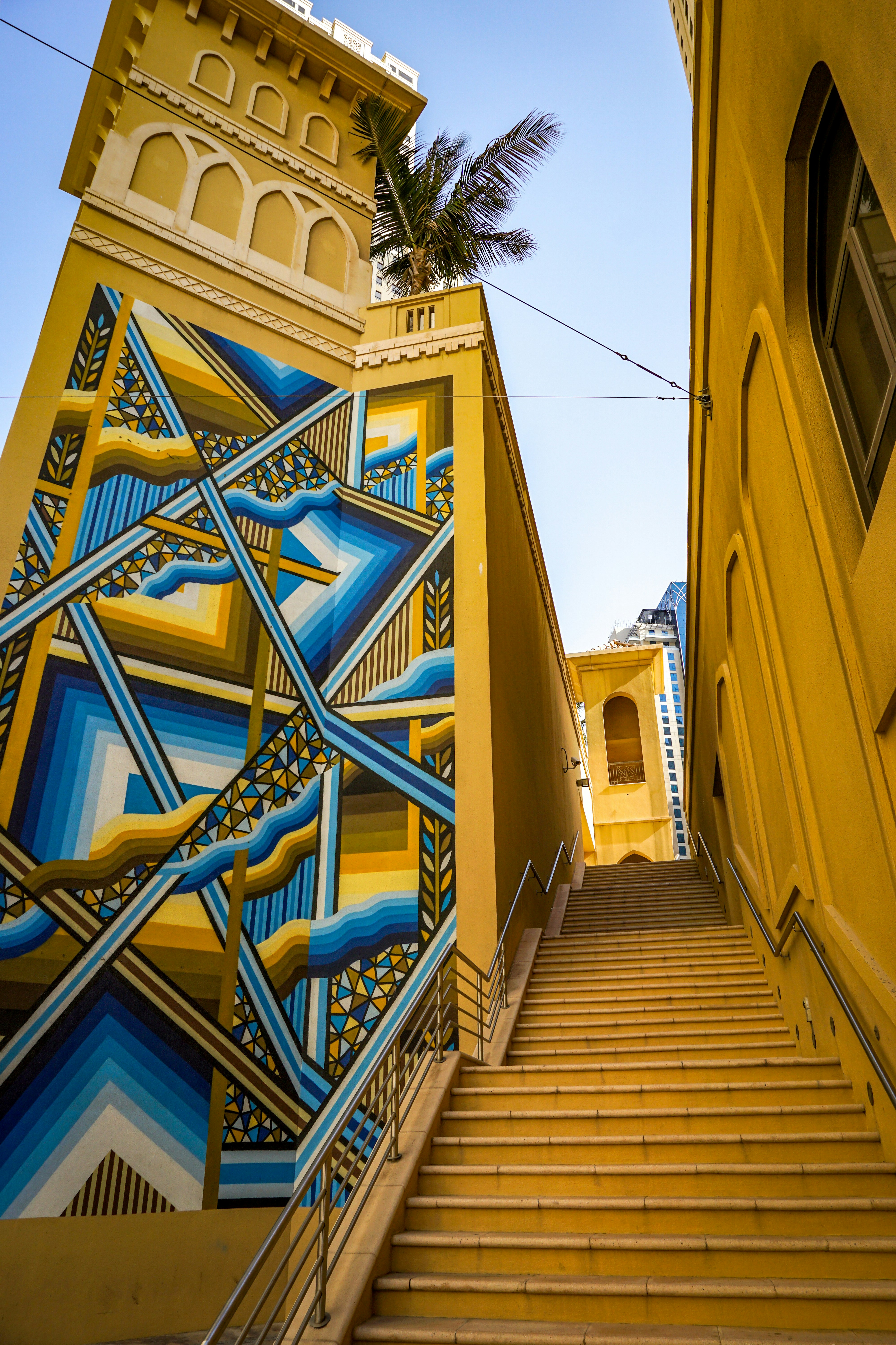 Jumeirah Beach-stigarnir í Dúbai, Sameinuðu Arabísku Furstadæmunum, eru frábær staður til skoðunar og ljósmyndunar. Þessi táknræna stigi er staðsettur á einni strönd milli Jumeirah Beach-hótelsins og Wild Wadi vatnsgarðsins og hefur orðið vinsæll áfangastaður til að taka fallegar myndir. Á daginn skapar gott náttúrulegt ljós fjölmörg ljósmyndatækifæri með mynstur, skuggum og ilmandi dýpt sem gefa hverri mynd einstaka fegurð. Útsýnið yfir sjóinn og sandströndina er einnig stórkostlegt og þegar sólin sest breytist himininn í appelsínugula, rauða og gulna tóna, sem veita ógleymanleg ljósmyndatækifæri. Heimsæktu þennan stað til að upplifa einstaka myndræna upplifun.